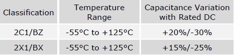 為了達到穩(wěn)定性的要求,一些應用中會指定電介質的選用,如軍標BZ和BX或IECQ-CECC 2C1和2X1分級: