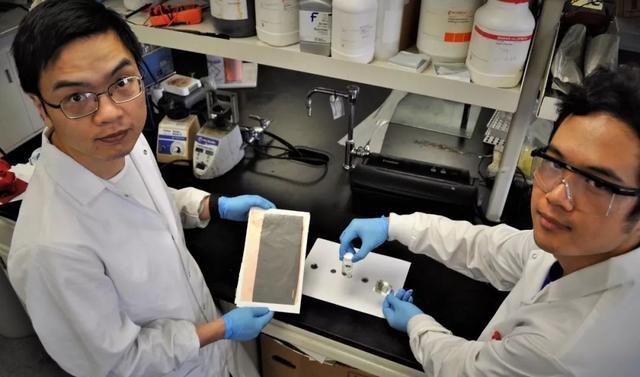電池的石墨電極,陳驥(右)手中為新型正極材料、WiS水基電解液(來源:采訪對象提供)