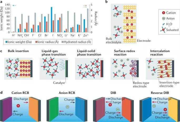 圖1a所示,在非金屬離子中,H+的離子質(zhì)量最低,半徑最小,與較大的金屬離子如陽(yáng)離子Li+、Na+、K+、Zn2+相比,H+的能量密度更高,動(dòng)力學(xué)更快。此外,陰離子型非金屬載流子通常比陽(yáng)離子型非金屬載流子具有更高的摩爾質(zhì)量和離子半徑,這導(dǎo)致了不同的電池的原理、性能差異。圖1b所示,非金屬離子在溶劑化和去溶劑下與電極材料相互作用,在非質(zhì)子溶劑中,溶劑種類和非金屬離子的溶劑化作用對(duì)電化學(xué)性能有很大影響。