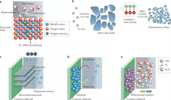 電荷存儲(chǔ)機(jī)制可分為離子插層的搖椅反應(yīng)機(jī)制、固-液-氣相中非金屬離子的氧化還原、氧化還原贗電容與插層贗電容(如圖1c所示)。各電池反應(yīng)具有不同的反應(yīng)動(dòng)力學(xué):擴(kuò)散限制反應(yīng)具有電池型行為,而非擴(kuò)散限制反應(yīng)具有贗電容型行為。電池的種類可以通過(guò)分析電解質(zhì)中非金屬載流子的運(yùn)動(dòng)方向來(lái)確定:①以陽(yáng)離子為穿梭離子的搖椅電池;②以陰離子為穿梭離子的搖椅電池;③雙離子電池,其中陽(yáng)離子移動(dòng)到陽(yáng)極,陰離子移動(dòng)到陰極;④反向雙離子電池,使陽(yáng)離子移動(dòng)到陰極,陰離子移動(dòng)到陽(yáng)極。