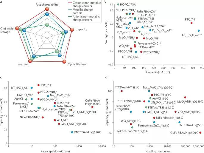 • 容量。理論容量大的電極材料可以有效提高輸出容量(圖5b)。在使用相同的電極下,與金屬離子相比,非金屬陽(yáng)離子儲(chǔ)能具有相當(dāng)甚至更高的容量,這一方面與他們自身可作為氧化還原中心有關(guān),可通過(guò)共價(jià)-離子鍵接受額外的電子,還跟其較小的離子半徑有關(guān),可充分利用電極材料的位點(diǎn)。