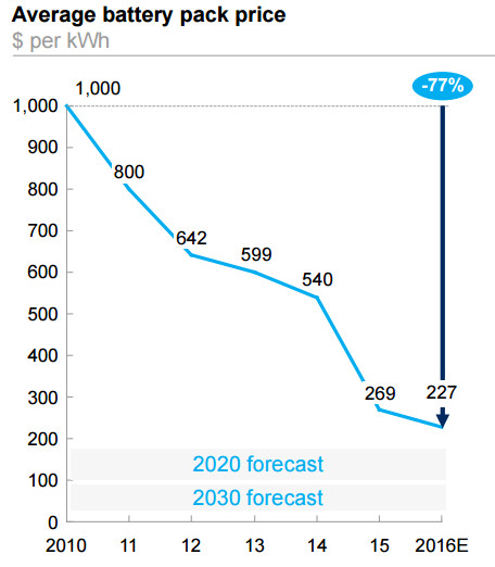 今年年初,麥肯錫發布了汽車動力電池調研報告,注意下圖,報告顯示電池平均成本從2010年的1000美元/kWh下降到了2016年的227美元/kWh。但從成本曲線走勢來看,2017年不太可能下降到145美元/kWh。不過既然是“平均電池成本”,自然有技術領先的企業電池成本低于227美元/kWh這一指標。