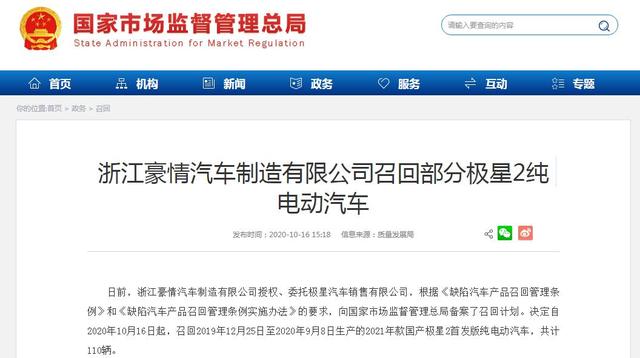10月16日電 據國家市場監管局官網消息,16日,浙江豪情汽車制造有限公司召回部分極星2純電動汽車,110輛極星2純電動汽車被召回,因動力電池能量控制模塊(BECM)軟件存在內部邏輯問題。